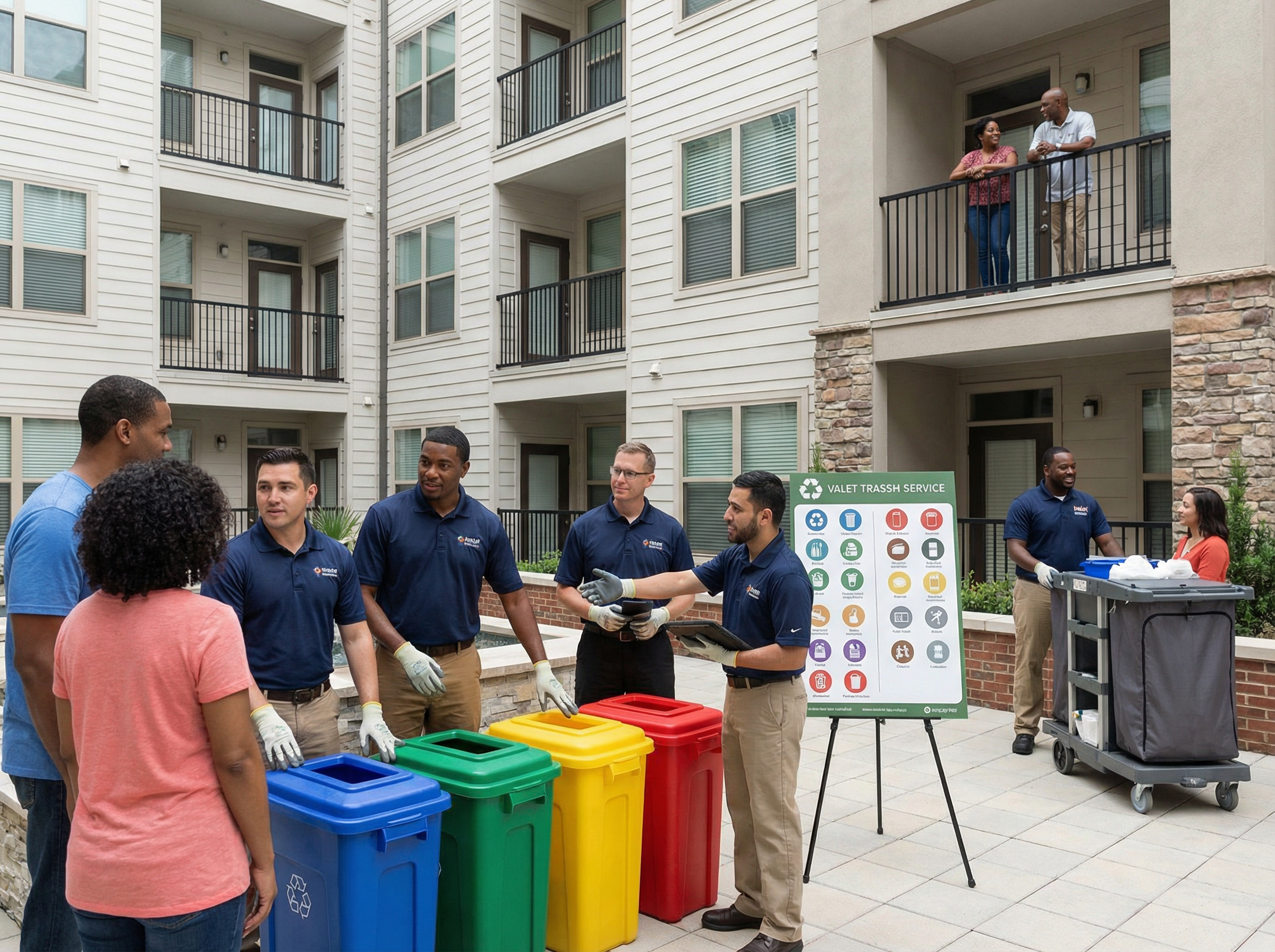 Trained valet trash staff following clear workflows on property routes.